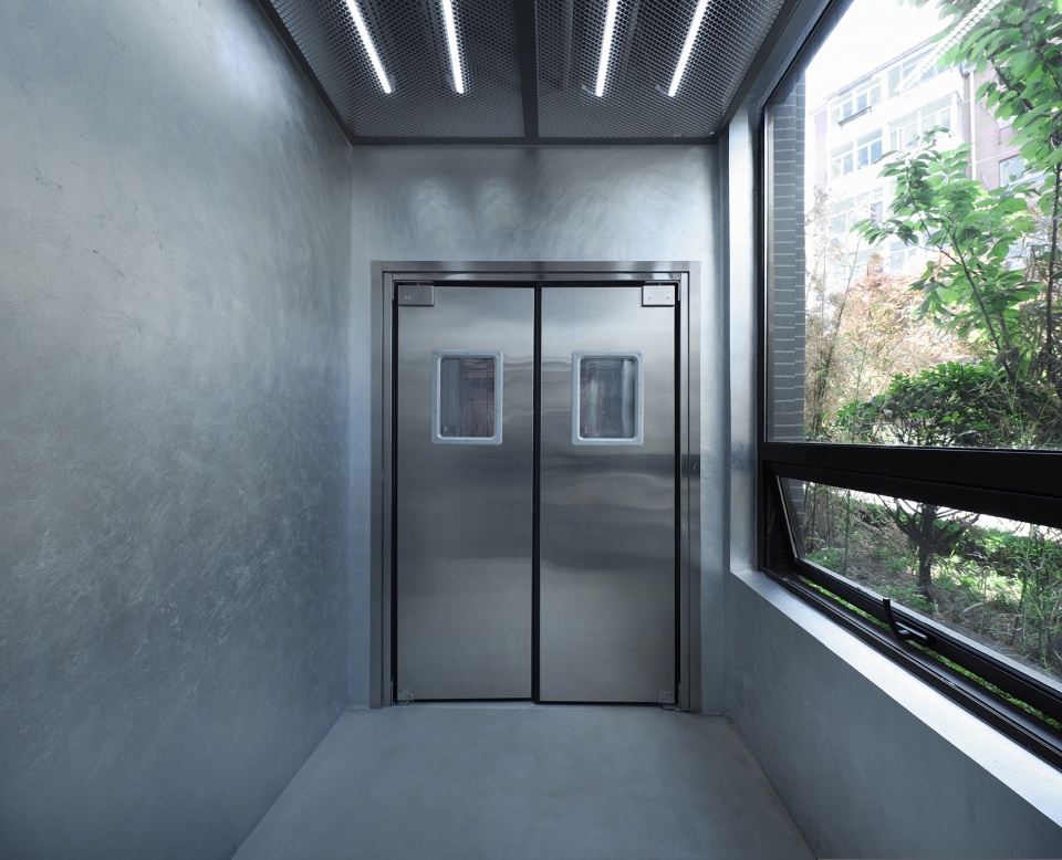空間有兩個入口,主入口保證通行和展示,次入口則作為一個工廠的精神象征。設計師采用工廠車間金屬推拉門和防撞門作為工廠的大門,將粗獷銳利的工業感發揮到極致。前廳四壁貼有銀箔,作為對電影《Factory Girl》的致敬。