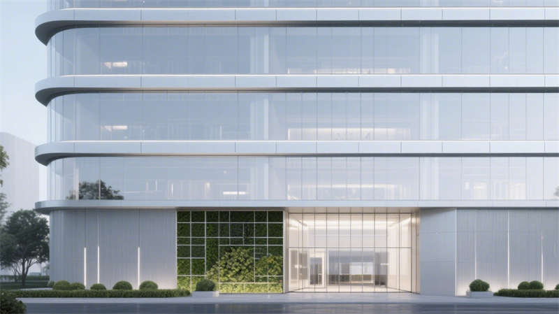 建筑外立面以流線型玻璃幕墻與啞光金屬線條勾勒科技輪廓,底部垂直綠植墻與光伏玻璃的融合,將生態(tài)可持續(xù)理念嵌入第一視覺印象。通透的挑高入口與室內(nèi)大堂形成光影聯(lián)動,淺白色大理石地面、懸浮式線性燈光與深藍(lán)色企業(yè)LOGO墻,以克制的色彩系統(tǒng)傳遞品牌調(diào)性,同時通過數(shù)字屏顯墻實現(xiàn)空間敘事動態(tài)化。