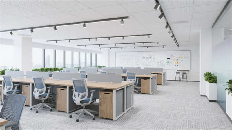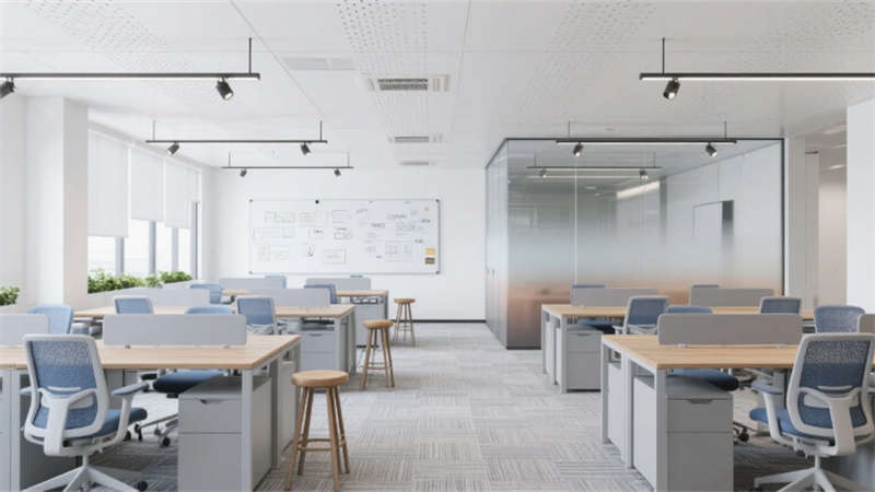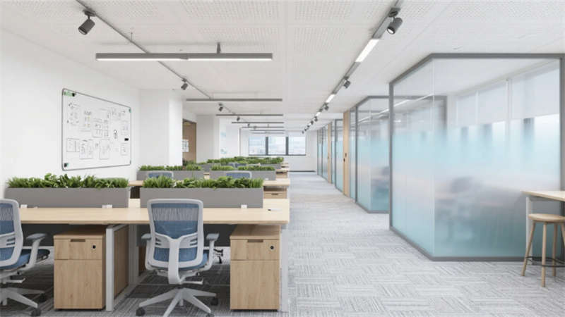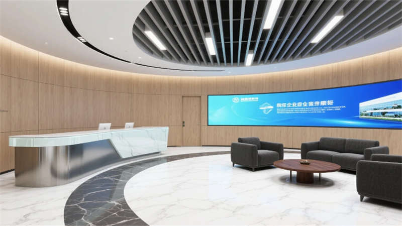 企業大堂延續外立面色系,雪花白大理石地面與深灰導視帶構建空間骨架,曲面木紋石背景墻通過背光企業標識形成視覺焦點,漸變鋁方通吊頂的線性光帶引導人流走向。開放式辦公區以灰橡木辦公模塊為核心,沖孔鋁板吊頂整合軌道射燈系統,漸變霧化玻璃隔斷內置綠植槽,編織紋地毯有效降低行走噪音。
