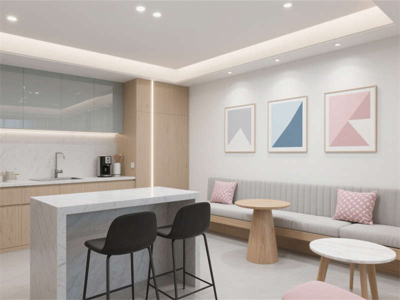 外觀設計上,采用淺灰色墻面搭配超白玻璃幕墻,玻璃內側的品牌標識與門前綠植相呼應,弱化了建筑的冷硬感,展現出簡約大氣的辦公形象。進入室內,前臺接待區以淺灰與米白為基礎色調,L型前臺搭配柔和燈光,等候區的布藝沙發與原木元素結合,給訪客帶來溫和專業的第一印象。?