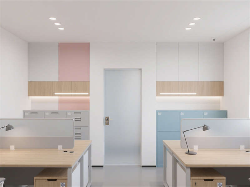 會議室聚焦會議需求,主視覺墻的色彩搭配緩解了會議的緊張感,智能會議屏與充足燈光滿足高效溝通。休閑茶水區作為員工放松的“第三空間”,卡座設計節省空間,色彩搭配活躍卻不雜亂,為員工提供舒適的休息環境。財務辦公室側重隱私與收納,磨砂玻璃設計兼顧采光與遮擋,充足的收納空間滿足財務辦公的特殊需求。儲物間則以實用為主,分區明確,便利的燈光設計提升了使用便捷性,整體保持與其他區域一致的風格,讓整個辦公室成為一個協調統一的整體。