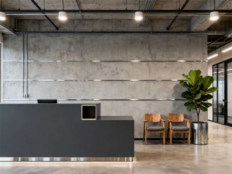 室內(nèi)空間延續(xù)整體風格,以深灰、淺灰與原木色為主色,搭配金屬元素點綴,材質(zhì)上運用水泥漆、裸露管線(簡化處理)、實木與玻璃,構(gòu)建出連貫的視覺體驗。前臺接待區(qū)用深灰色前臺與水泥漆背景墻奠定基調(diào),等候區(qū)的原木色座椅緩解工業(yè)風的冷硬;開放辦公區(qū)以規(guī)整的桌椅布局保障高效辦公,共享工作臺與綠植隔斷提升空間活力。?