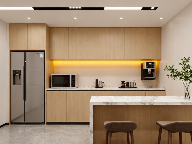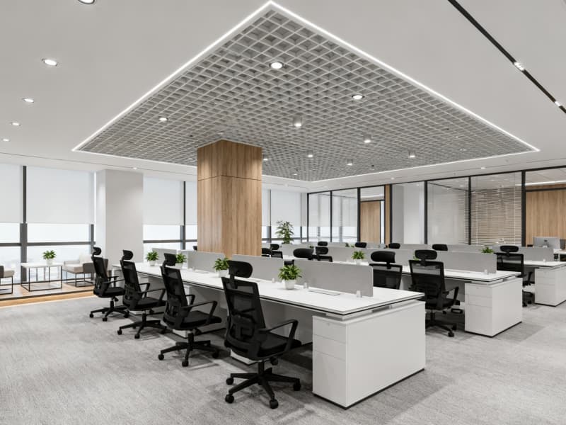 空間布局上,科學劃分接待區(qū)、開放辦公區(qū)、獨立辦公室、會議室、茶水間等功能區(qū)域,優(yōu)化動線設計,保證辦公流程順暢。開放辦公區(qū)注重靈活性與協(xié)作性,模塊化家具與可移動隔斷適配不同工作場景;獨立辦公室與會議室強調私密性與專業(yè)性,通過材質與燈光營造專注氛圍;休閑茶水間與休息區(qū)則注重放松感,自然元素的融入緩解工作壓力,平衡工作與休息。