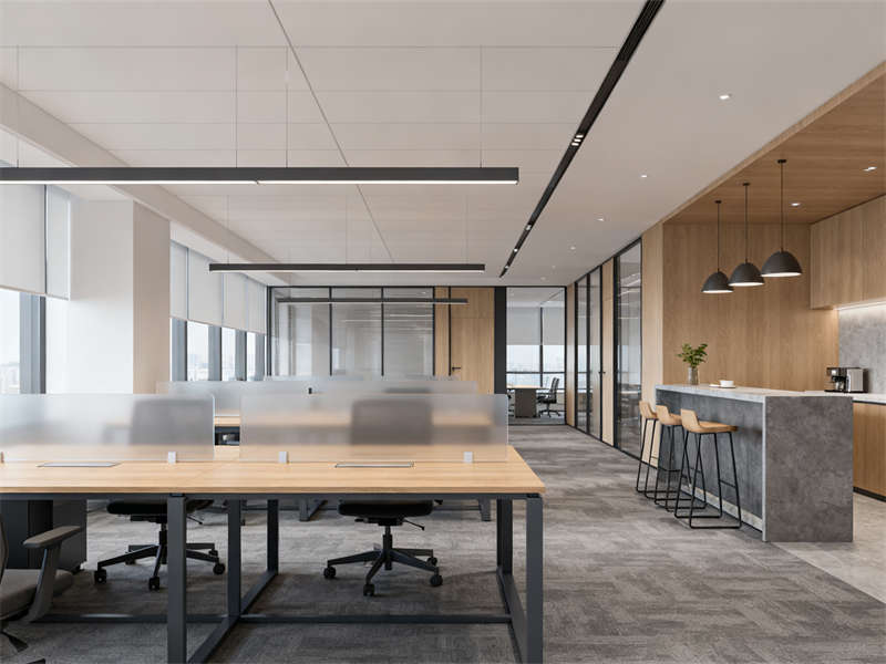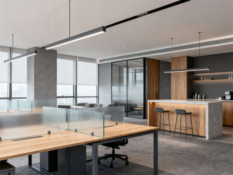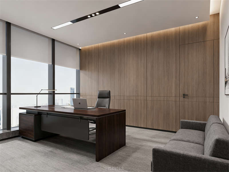 開放辦公區以通透協作為設計重點,半透明磨砂玻璃隔板兼顧隱私與互動,木色桌面與深灰金屬支架結合,延續整體材質基調,搭配簡約照明,營造專注且不壓抑的工作氛圍。獨立辦公室劃分出辦公與接待區域,木飾面背景墻搭配淺灰布藝沙發,在保持商務感的同時,增添柔和質感,滿足私密溝通需求。