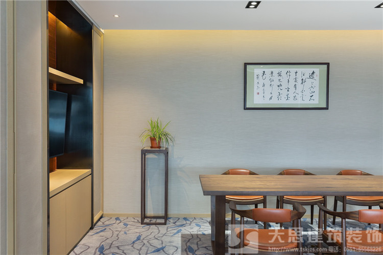 “你站在橋上看風景,看風景的人在樓上看你。明月裝飾了你的窗子,你裝飾了別人的夢。”人與人、人與景之間的交織互動在卞之琳的《斷章》里詩意呈現,也同樣貼合設計師為同進置業公司辦公室定下的設計思路。他的空間設計結合江景地利、都市人文,在實用功能、格調品位之外,借助綠植規劃等巧妙手法,進一步突顯地產公司的職業形象與社會責任,不僅充分納景入室,更樹立起友好對外界面,成為一道嶄新的綠色都市風景。