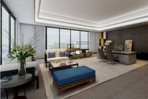 總經理辦公室采用落地窗的形式將空間在視覺上向外擴展,同時增加視野的廣度,在工作間隙中觀賞一番自然之景,疲勞盡可除去。為了緩解公辦空間彌漫的焦慮感,在整體布局上,設計師更多地朝著簡約靠攏,但絕不僅僅只是如此,在這個空間中,我們可以看到裝修風格的多重交叉,局部呈現出簡約的風格,但該有的一個都不會少: 大沙發群、小品茶區、主體辦公桌、書架及展示柜等。