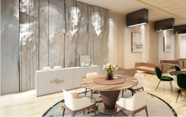 主體的圓形餐桌上懸掛的是一盞仿生吊燈,隨枝干散發開去的白色燈盞猶如悄然開放的花朵,為整個空間提供一種溫馨而典雅的就餐環境。同時,在餐桌椅上大膽地使用了青藍色,熟悉中國畫的人也許一眼就看出了設計的用意:青藍是國畫中較為常見的一種大面積使用的色塊,更常見于山水畫當中。