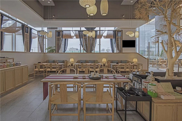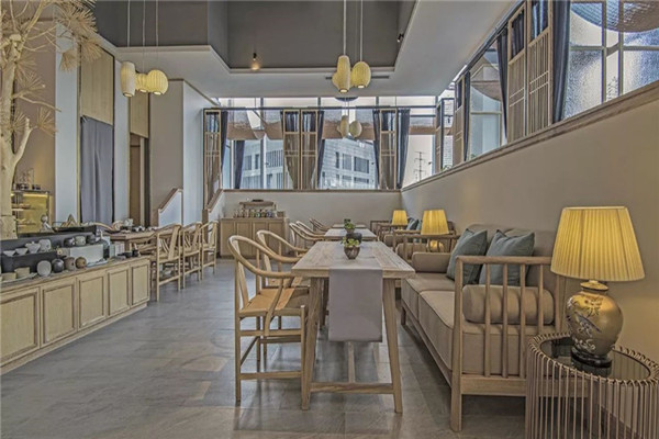 茶藝館的空間設計要與其總體設計風格相匹配。在空間布置上可通過虛的手法遮擋視線,似隔非隔,隔中有透,實中有虛。例如利用布慢、漏墻、珠簾、屏風、竹籬、木柵等緩沖通道與視線;又如,利用通道的回繞曲折相通,轉身回眸處別有一方天地。適當的分隔還可滿足部分客人不想被打擾的心理,這就是所謂的"園必隔"。