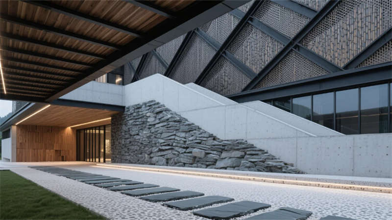 建筑外觀以滁州竹海為靈感,斜交網格結構勾勒出山勢輪廓,穿孔鋁板在光影間呼吸。懸浮橡木雨棚如云中棧橋,將自然意象引入現代語境。青石板基座延伸至室內,形成連貫的在地敘事。