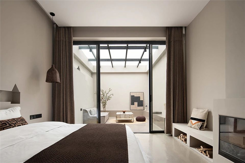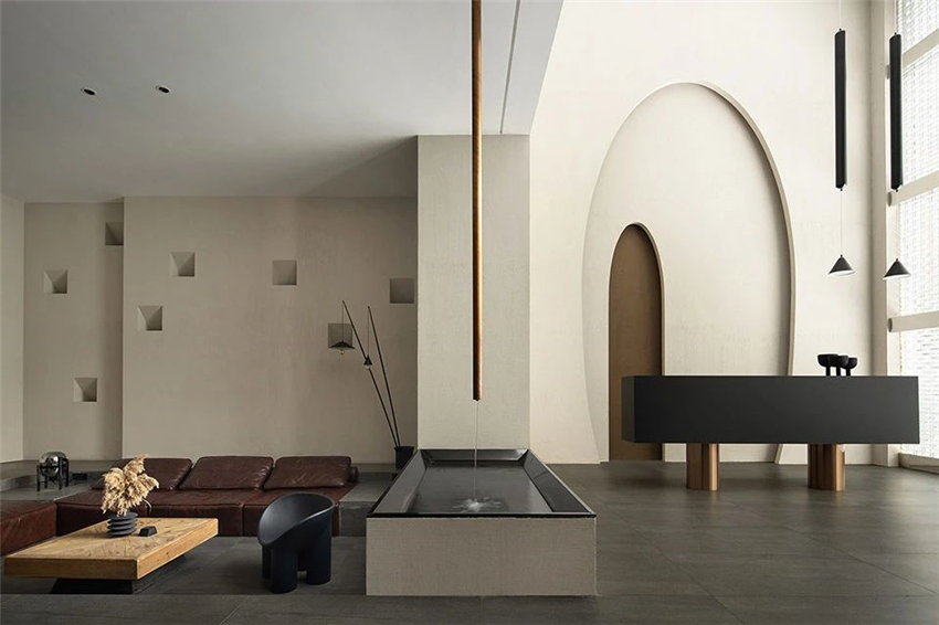 中性的色彩美學(xué)為基調(diào),無彩色與暖調(diào)的咖色相互補(bǔ)充,一抹深色,使空間靜默下來,將溫柔緩緩釋放。柔涓的水流墜落在水面上,蕩起一圈小渦,我們喜歡這種流動(dòng)性,有種輕盈的感覺。