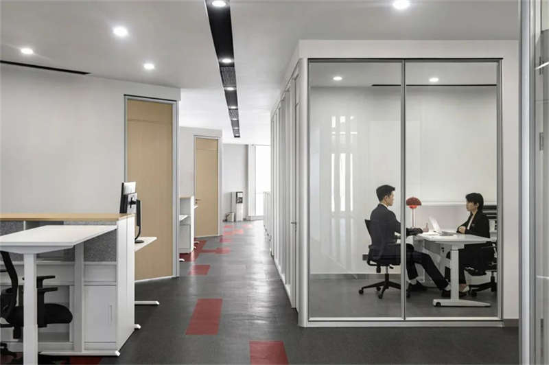 由于原辦公室把獨立辦公室放在靠幕墻一側導致開放辦公區光線不足,在改造過程中設計師把獨立辦公室往核心區域設置,把幕墻一側打開,陽光傾瀉,將城市天際線和內部空間的交互限制解除,讓城市天空與四季變化成為空間的景觀和陳設。