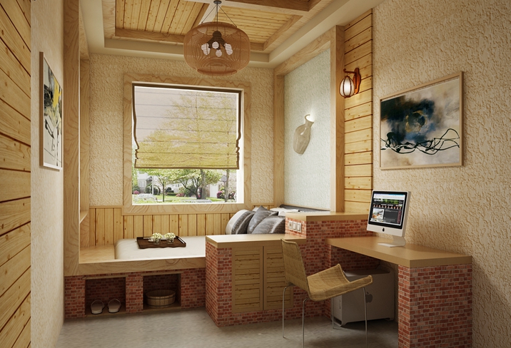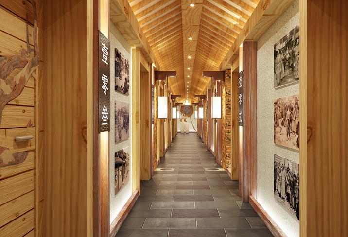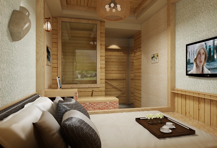 該項目主要是以近代的炕及木制品為元素,房間的床、電腦桌、電視柜、床頭柜都是用紅磚清水墻砌的,墻面是白色的彈涂顆粒飽滿十分的美觀,頂面局部采用的是桑拿板吊頂,其余部分為石膏板吊頂噴彈涂,加上特色的壁燈,讓人置身其中有種回到中國近代的感覺。