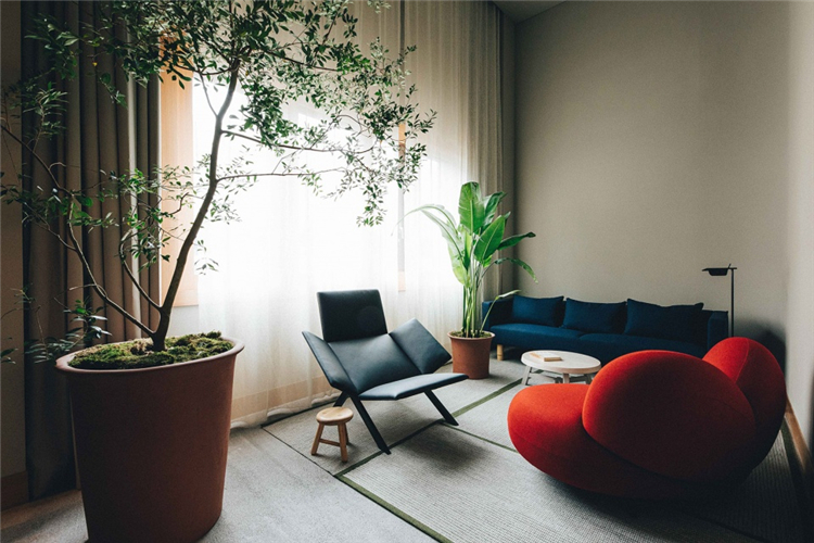 酒店的客房同樣色彩斑斕??头康拈_放空間中央立有大型紗柱,懸掛著自然染色的靛藍色漸變織物。客房空高開闊,四周擺設有CKR設計的沙發,皮革躺椅及一系列盆栽裝飾。同時,房間內配有唱片機及精選的黑膠唱片,為房間帶來了親切感。房間內的照明采用特別設計的燈具,其中以定制的紙質燈最具特色。此外酒店客房,套房及復式套房中,都采用了紡織品裝飾的定制雙人沙發。