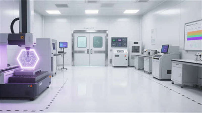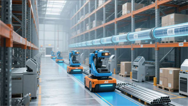 質檢實驗室以白色潔凈空間為主軸,三坐標測量機與光譜分析儀配備環形補光系統,數據看板實時投射SPC管控圖表,凸顯精密制造的嚴謹性。倉儲區通過12米高智能立庫與AGV物流機器人聯動,橙色激光導航帶與電子標簽系統實現“黑燈倉儲”效能。