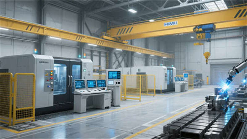 核心生產區以灰調環氧樹脂地坪為基底,大型CNC加工中心與智能機械臂組成“U”型產線,頂部集成黃色安全標識的橋式起重機軌道,配合藍光焊接機器人動態光軌,形成極具未來感的工業圖景。辦公區突破傳統廠房設計,通過混凝土肌理墻面、懸浮式玻璃會議艙及企業色聲學模塊,構建開放互聯的智慧管理中樞。