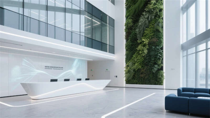 步入其中,純凈的白色與淺灰基調構筑出開闊明亮的基底,大面積玻璃幕墻邀請陽光自由流淌。室內,垂直綠墻與蔥郁盆栽如音符般跳躍,為嚴謹的研發環境注入蓬勃生機。開放辦公區強調協作與靈活,可書寫的玻璃墻面激發無限創意;高度自動化的核心生產車間則如同精密的樂章,潔凈無塵的環境、流線型的自動化設備與身著無塵服的工程師,共同演繹著尖端制造的嚴謹與高效。從充滿科技藝術感的展示廳、活力四射的創意協作區,到靜謐專注的工作艙、溫馨舒適的休憩社交中心,再到專業大氣的會議空間,每一處功能區域都浸潤著統一的未來主義美學——簡約的線條、智能的光影、環保的材質與克制的企業色點綴。