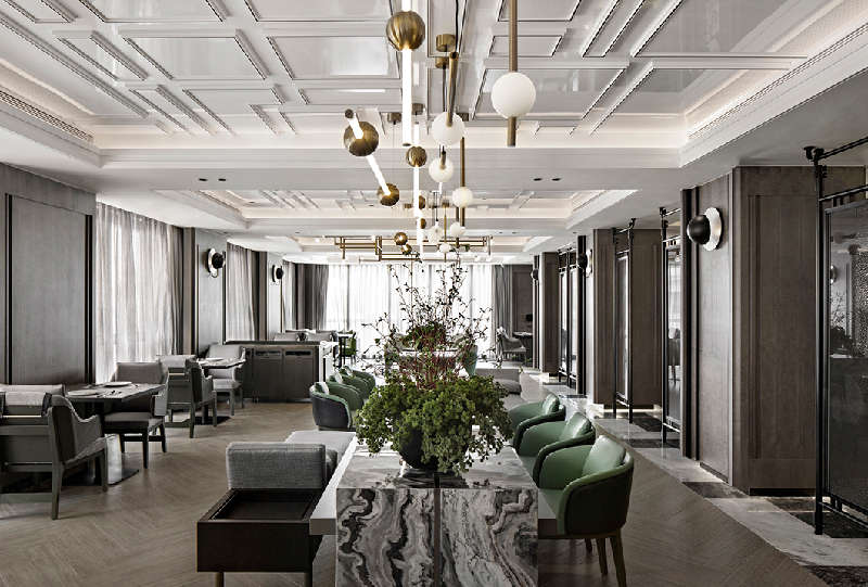 酒店大堂的設計著眼於化繁為簡,摒棄以往酒店富麗堂皇的水晶吊燈,采用了更為輕快時尚的設計,成穩大氣的色調給顧客一種回歸本質的自由形態。