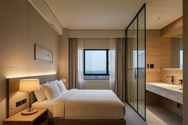 客房設(shè)計(jì)延續(xù)了現(xiàn)代簡(jiǎn)約的風(fēng)格,淺木色與灰色的主色調(diào)搭配,營造出寧靜而舒適的居住環(huán)境。寬敞的落地窗將城市美景盡收眼底,智能燈光系統(tǒng)與電動(dòng)窗簾為您提供便捷的入住體驗(yàn)。干濕分離的衛(wèi)生間采用大理石臺(tái)面與玻璃隔斷,既實(shí)用又彰顯品質(zhì),讓您在繁忙的旅途中也能享受片刻的放松。