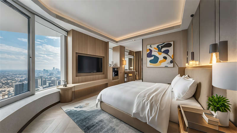 本案為6000平現(xiàn)代輕奢風(fēng)格商務(wù)酒店,以 ' 城市綠洲 ' 為設(shè)計理念,將自然元素與科技美學(xué)融合。空間規(guī)劃采用動靜分區(qū)原則,1-3 層為公共接待區(qū),4-8 層設(shè)置標(biāo)準(zhǔn)客房,9-10 層規(guī)劃行政專屬空間。色彩體系以香檳金、深海藍(lán)、暖灰為主調(diào),搭配天然木紋與石材肌理,營造低調(diào)奢華的氛圍。智能系統(tǒng)貫穿全樓,包含環(huán)境光感調(diào)節(jié)、聲學(xué)優(yōu)化及空氣質(zhì)量管理。特色設(shè)計包括大堂三維立體藝術(shù)墻、客房可變光環(huán)境系統(tǒng)、頂層無邊際星空泳池,以及模塊化多功能會議系統(tǒng),充分滿足商務(wù)客群對品質(zhì)與效率的雙重需求。