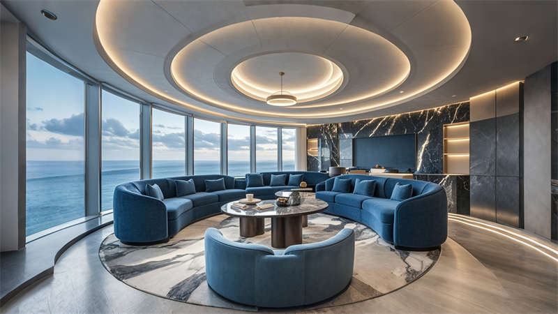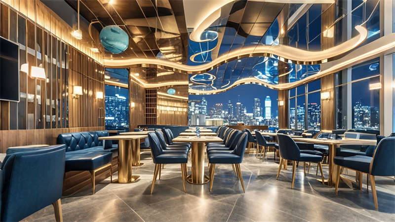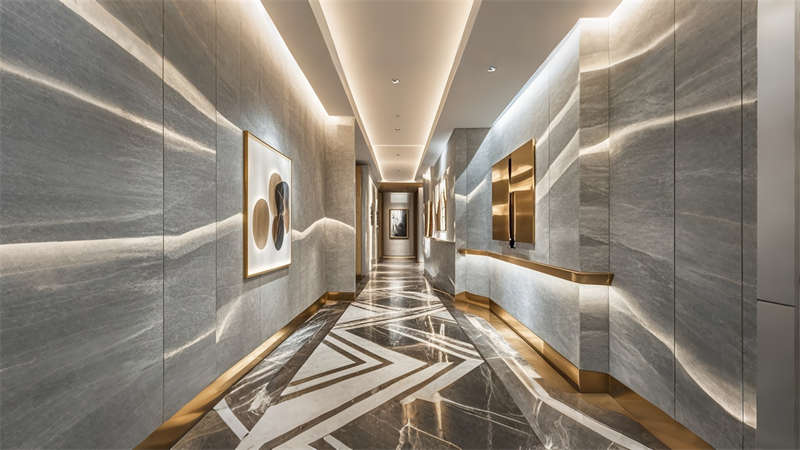 色彩體系以香檳金與深海藍(lán)為主調(diào),大堂采用香檳金金屬線條勾勒建筑肌理,搭配深海藍(lán)大理石營造視覺重心。客房區(qū)運用暖灰硬包墻面平衡色彩強度,通過2700K暖光與4000K中性光分區(qū)照明塑造晝夜場景。材質(zhì)組合注重層次:大理石地面、金屬構(gòu)件、絨布軟包形成質(zhì)感三部曲。