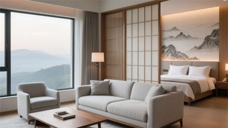 大堂以格柵天花與山水背景墻定調,光影交錯間傳遞寧靜力量。餐廳借竹編與紙燈演繹傳統匠心,窗外庭院景觀延伸視覺層次。客房摒棄繁復裝飾,棉麻材質與低飽和度色彩引導深度放松,套房通過屏風巧妙劃分動靜區域。茶室以博古架和宣紙屏風構筑禪修意境,而庭院花園的枯山水與竹影,則成為自然與建筑的共生隱喻。