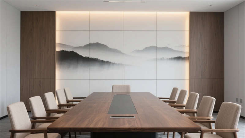 健身區與會議室平衡功能與美學,金屬器械融入水墨肌理,會議長桌呼應胡桃木的溫潤質感。整體設計弱化邊界,讓光、影、材質在流動中對話,為合肥注入一處隱于城市的東方精神綠洲。