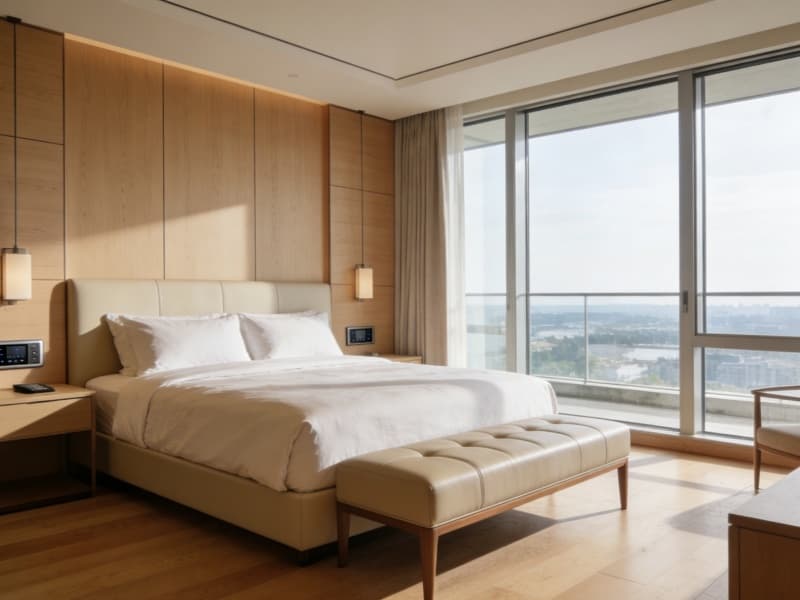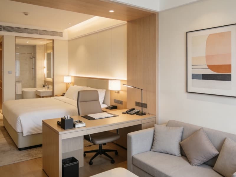 二至四層為住宿層,規(guī)劃約80間客房,包括豪華房、行政房等房型。客房以淺木色為主調(diào),搭配真皮軟裝與柔和燈光,營造溫馨氛圍。每間客房均配備智能客控系統(tǒng),方便客人操作。