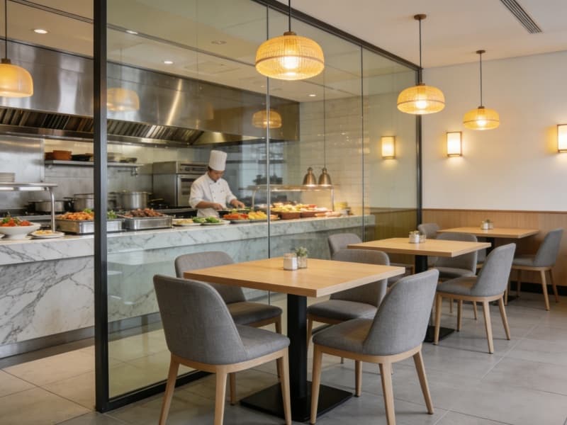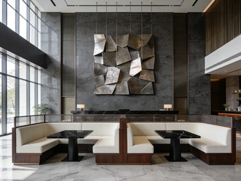 酒店一層為公共區(qū)域,大堂地面鋪淺灰色大理石,前臺背景墻以巖板結(jié)合藝術裝置,彰顯格調(diào)。大堂吧設半私密卡座,供客人休憩交流。全日制餐廳配備開放式廚房,可讓客人直觀感受美食制作過程。