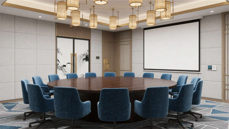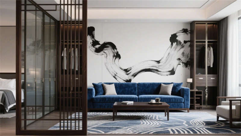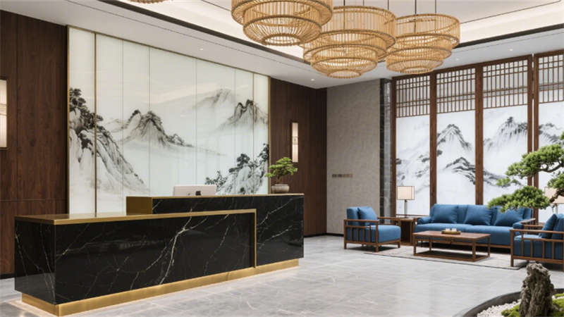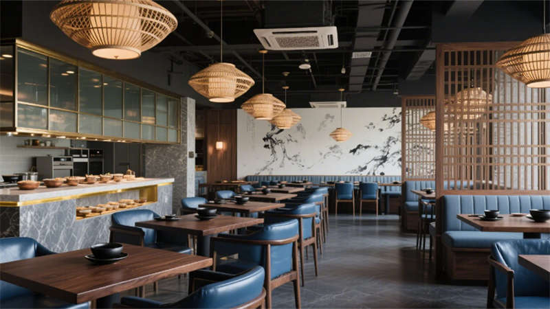 步入大堂,深胡桃木墻面與淺灰石材地面構(gòu)成經(jīng)典東方底色,水墨藝術(shù)玻璃屏風(fēng)似山巒疊嶂,懸浮竹編吊燈以編織肌理軟化空間。靛藍(lán)色沙發(fā)與黃銅細(xì)節(jié)的點綴,既延續(xù)外立面色彩邏輯,又激活視覺層次。餐飲空間延續(xù)木格柵語言,竹編燈罩與黑陶器皿在開放式廚房的金屬框架中碰撞,演繹“新舊共生”的餐飲儀式。