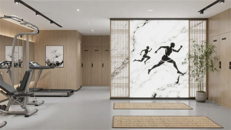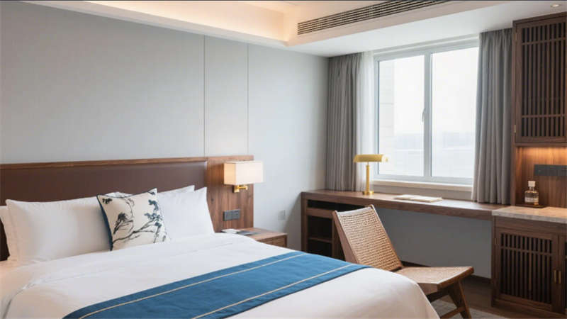 客房區(qū)域以“去符號化”手法詮釋東方美學(xué):深木紋床頭背板嵌入隱晦的水墨紋樣,藤編躺椅與迷你吧木格柵柜體,在3000K暖光中營造居停的松弛感。套房通過絲絨沙發(fā)與抽象水墨畫提升奢華調(diào)性,浴缸區(qū)的竹藝卷簾巧妙平衡通透與私密。公共空間亦貫徹統(tǒng)一語匯——健身房竹編地墊與水墨運動壁畫、走廊絹絲燈箱與枯山水景墻,皆以現(xiàn)代材質(zhì)轉(zhuǎn)譯傳統(tǒng)元素。