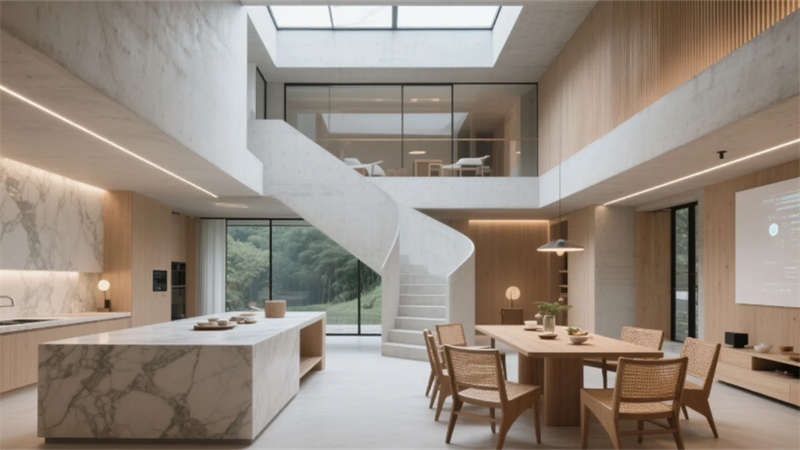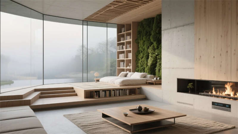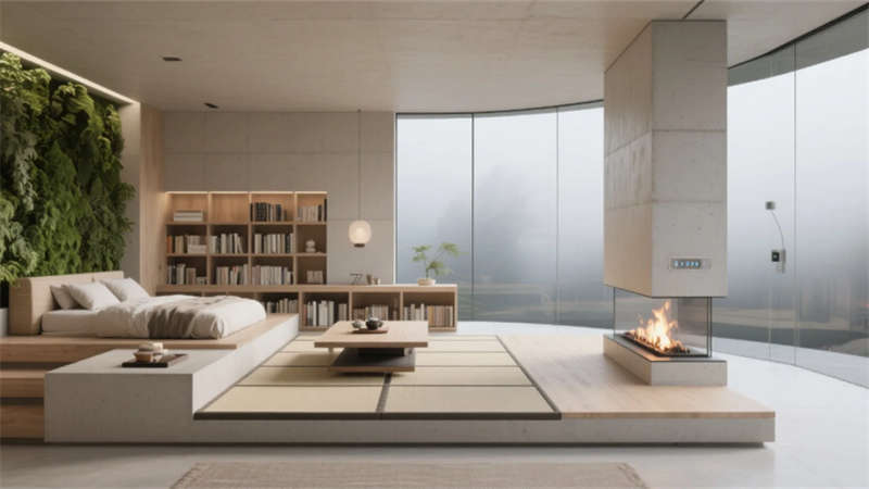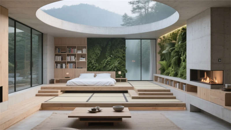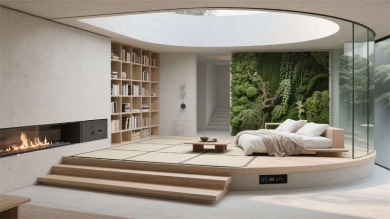 客房以極簡的智慧回應棲居本質(zhì)。榻榻米地臺消弭床與地面的界限,270°環(huán)景霧化玻璃輕觸即透,仿生綠植在智能光影中呼吸生長,隱藏式投影幕布落下時,星空與林海皆成私享背景。階梯書吧的垂直綠植墻下,模塊化沙發(fā)隨需求自由組合,全息粒子在空氣中勾勒出流動的藝術,而巖板中島餐廳里,藤編座椅與吊燈矩陣的光暈交織,智能調(diào)光天窗讓每一餐都浸染著天光的溫度。