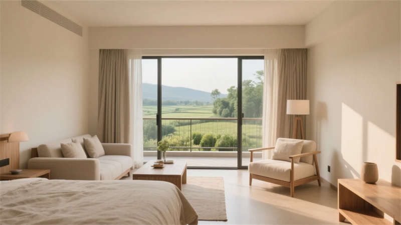 這座鄉(xiāng)村民宿以現(xiàn)代簡約風(fēng)格為核心,將自然與建筑融為一體。設(shè)計強(qiáng)調(diào)線條的干凈利落和材質(zhì)的原生質(zhì)感,白色墻面與木質(zhì)結(jié)構(gòu)形成對比,大面積的玻璃引入田野與天空的景致,讓室內(nèi)外界限模糊。庭院保留原生植被,通過碎石與木平臺的組合,營造出輕松的氛圍。