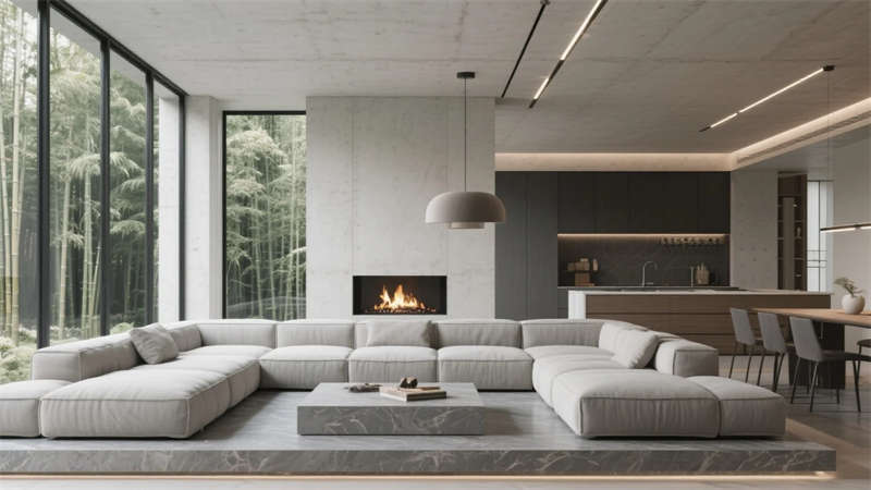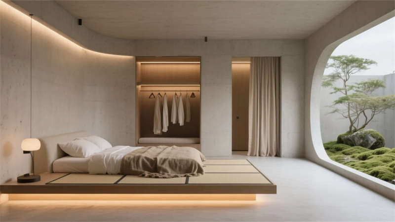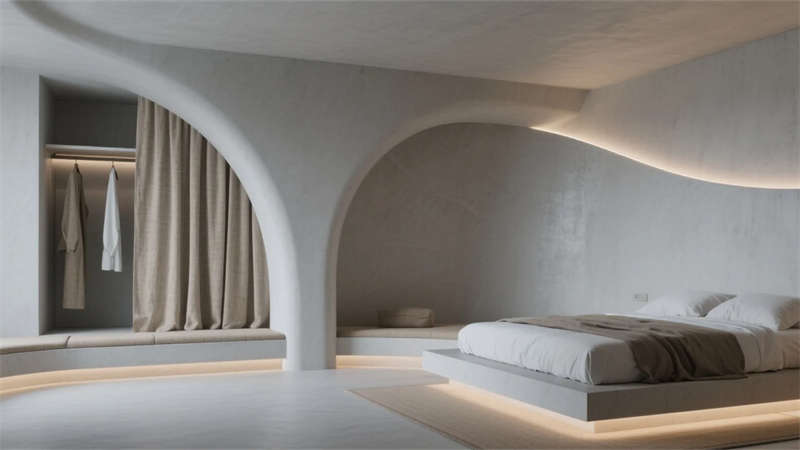 衛(wèi)浴空間化身立體水景容器,鏡面天花反射青石浴缸與垂吊綠植,形成虛實交織的自然劇場。所有構(gòu)件皆服務(wù)于居者與環(huán)境的對話,混凝土墻體在晨昏光線中呈現(xiàn)不同肌理,定制家具的圓弧收邊柔化現(xiàn)代主義的冷冽。