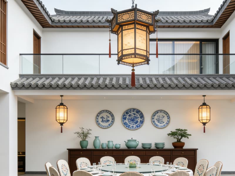 空間布局上,科學劃分公共區域與私密客房兩大板塊,公共區包含庭院、茶室、餐廳、書吧等功能區,庭院植入徽派馬頭墻元素與青石板小徑,搭配枯山水景觀與原生綠植,營造靜謐雅致的入戶氛圍;茶室采用實木茶桌與半通透屏風,墻面懸掛徽州版畫,為客人提供品茗交流的休閑空間;餐廳以暖木色為主調,配備開放式明檔廚房,兼具特色餐飲與小型聚會功能;書吧陳列安徽地域人文書籍,搭配柔軟布藝沙發,打造放松閱讀的靜謐角落。
