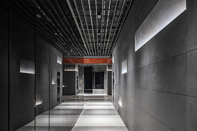 室內空間造型多以棱角分明的幾何形體為主,減少裝飾類細部,鐵銹褐、水泥灰、煙熏黑等暗冷色調元素交織在一起。局部通過紅磚作為點綴,減少淺色系材質的使用,讓自然光線將空間變得更有質感。