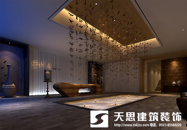 六安瀾庭養生會所采用簡約現代風格。養生會所大廳一座異形的藝術品,獨特時尚,一傾而泄的水晶燈,在荷花屏風的映襯下,高貴自然,富有藝術感。洽談區、接待區的裝修設計沒有采用過多的裝飾,局部的深褐色吊頂以及墻體,突出了養生會所的獨特之道。整個養生會所的軟裝搭配也是恰到好處,體現了養生環保之意。裝修設計休閑自然,是放松娛樂的不錯之選。