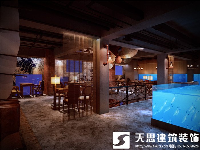 銅須水族主題會所,空間造型大氣磅礴,初入室內即被粗獷自然的設計所震撼。給人一種無限擴張的空間力量。空間材料和色彩的運用細膩而大膽,情節(jié)化的場景布置與戲劇性的張力設計營造出豐富的視覺享受。