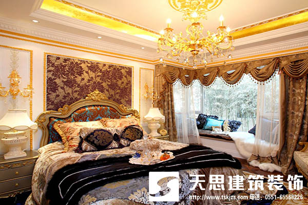 這個和上圖有明顯的區別,這是一個歐式裝修風格的臥室。吊頂采用極為歐式還有布藝窗簾。燈槽也是采用了金色作為背景色。使整個空間看起來極為金碧輝煌,更中式的比較歐式顯得比較富麗堂皇極為惹眼。但是中式講究的低調內涵,大氣和沉穩。這只是燈飾在兩種中袖風格中不同的作用。其實現實中裝修風格多樣化,配合裝修材料和軟裝的搭配選擇合適的燈飾,能夠給你帶來更多的驚奇。
