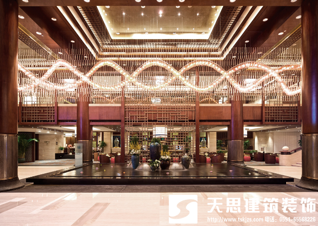 大堂的另一個(gè)風(fēng)格以抽象的格柵為裝飾,在中央景區(qū)的水景以寧靜來突出水的主題,并以木格柵與水景組合成抽象的構(gòu)成。吊燈以水泡燈作為裝飾,有溫泉?dú)馀莸碾[喻,突出酒店設(shè)計(jì)的主題。
