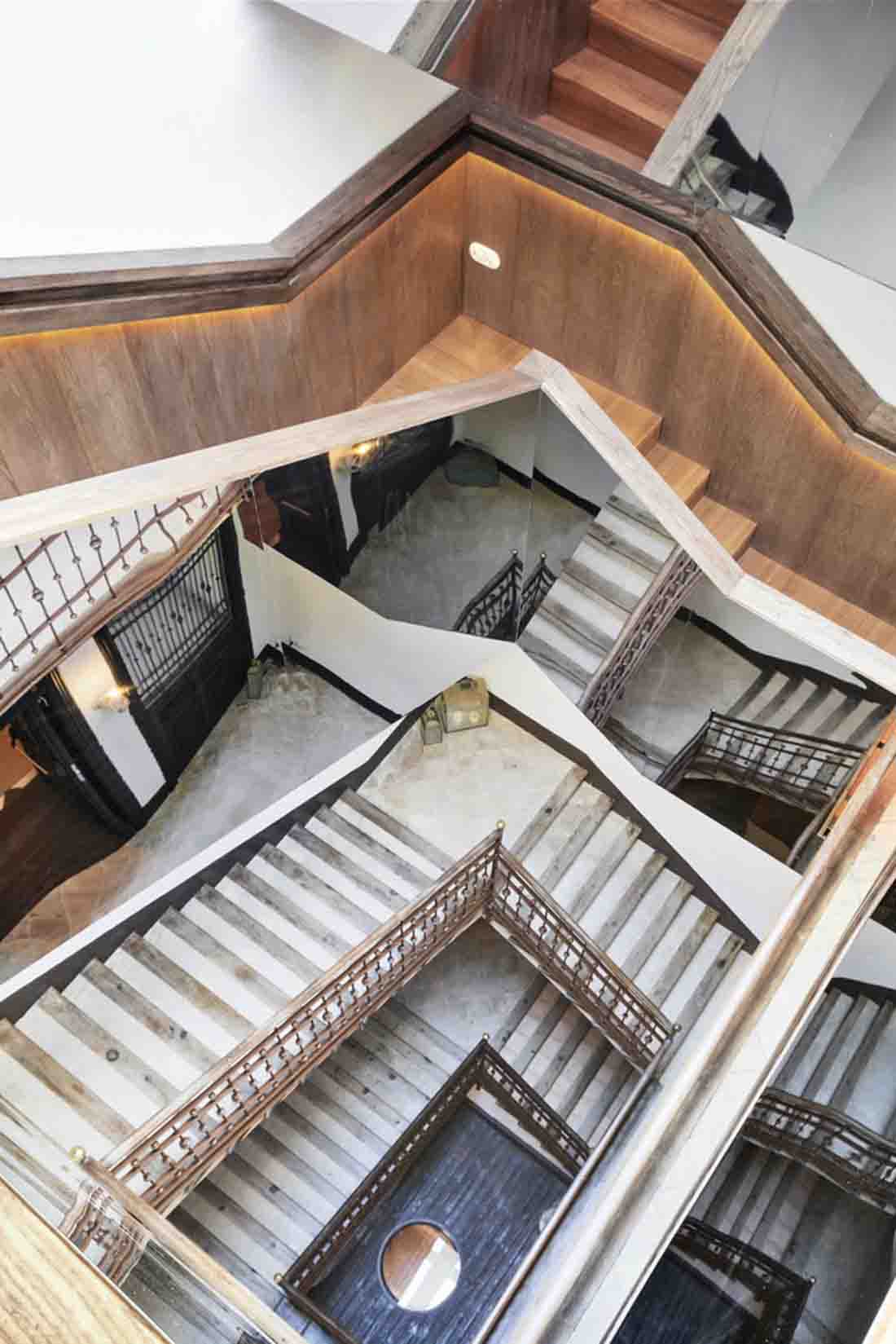 在主樓梯中,天窗被水淹沒,變成了一個帶有透明底部的小水池,在水中形成了光的活動,使樓梯上充滿了反射。