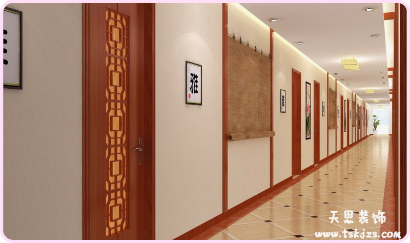 走廊是室內(nèi)流通空間的主要部分,其空間特點(diǎn)是狹長(zhǎng),且缺少變化,人在這種空間中容易產(chǎn)生單調(diào)感。因此,在設(shè)計(jì)上應(yīng)做一定的藝術(shù)處理。使其既不能過(guò)于華麗、復(fù)雜,也不宜過(guò)于簡(jiǎn)單、呆板、應(yīng)在墻壁上做一定的裝飾點(diǎn)綴。如做出口線、偏倚柱、外門套和墻壁裝飾線條的藝術(shù)處理,以及字畫或燈光的點(diǎn)綴。在特殊功能區(qū)的路段,可以做色彩變化或不同的裝飾處理,從而形成 統(tǒng)一中有變化的視覺(jué)效果。在通常情況下,走廊的設(shè)計(jì)要求是:應(yīng)有充足的光照度、統(tǒng)一和諧的界面裝飾,清新淡雅的色調(diào)和明確的導(dǎo)向指示。