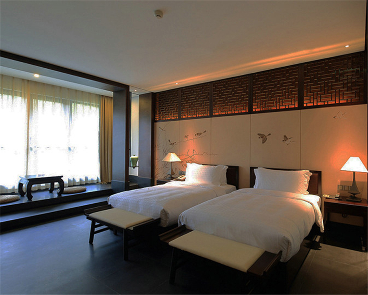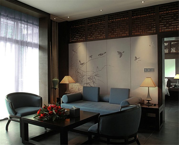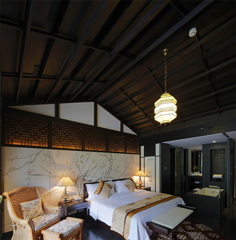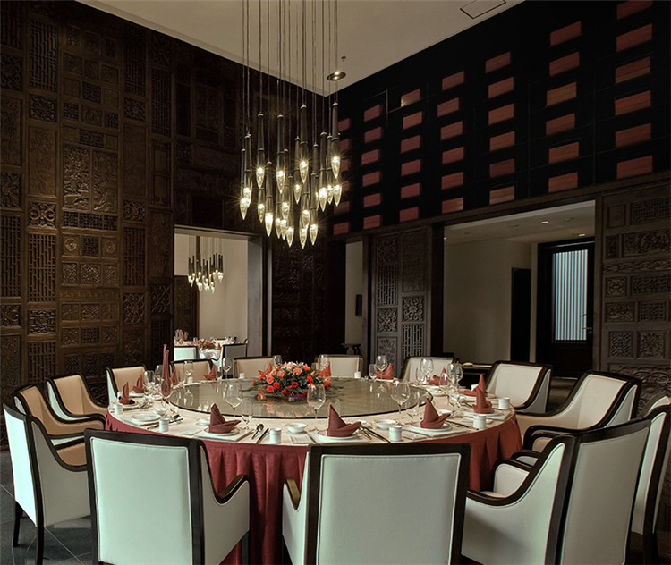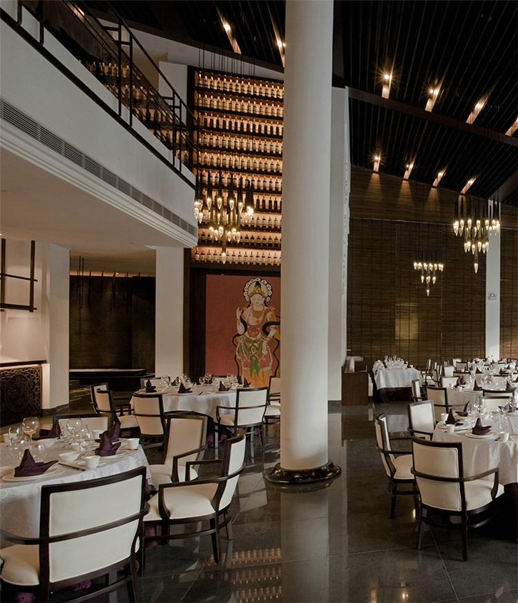 走入大堂,室內空間寬闊,天花鱗次櫛比通向樓梯方向,墻面灰色石材雕刻,將桃花源記中的詩句映入客人眼簾,禪境古意撲面而來。鏤空屏風隔墻的設計,讓空間隔而不斷,與具有傳統韻味的家具和配飾相互交融,打斷俗世的紛擾。柱子和天花上的裝飾燈具,利用金屬和木材兩種截然不同的材料和質地,創造空間內在張力,透過銳利的金屬、細膩的木質線條強調空間結構,精致筆挺的吊燈,令空間由內向外展現獨特魅力。