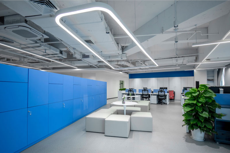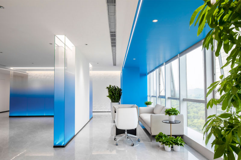 為了體現客戶的品牌形象和影響力,設計師將“創新、科技、便捷”的理念融入到空間的每個環節,從企業的VI色中提取出藍色運用到整體空間中。