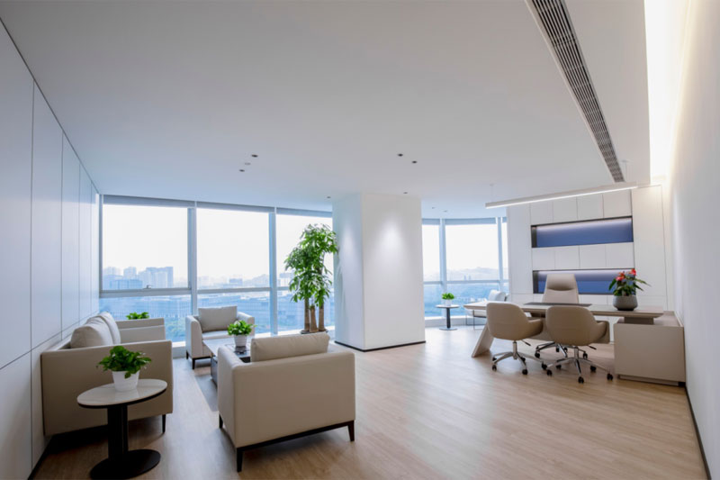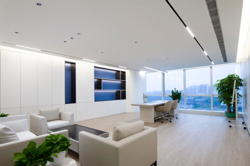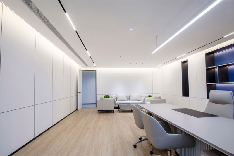 總裁辦整體空間體塊分明,大面積的木飾面體現出品質和細節,藍白的色調與空間功能的巧妙搭配,輕盈的空間蕩漾著優美的旋律感。