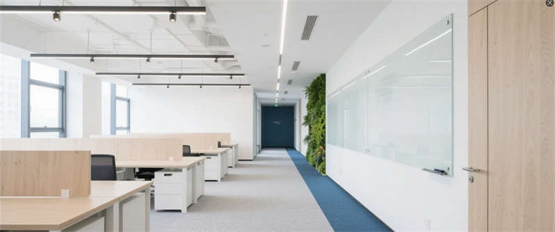 本設計以“高效、舒適、科技”為核心,打造現代簡約風格辦公空間,總面積2000㎡,通過統一色調(淺木色+淺灰+深藍VI色)、材質(玻璃/木飾面/啞光金屬)與無主燈照明體系,實現功能與美學的深度融合。