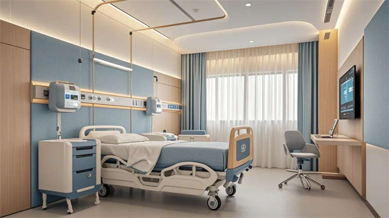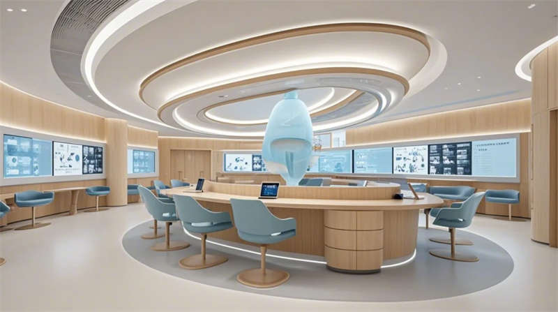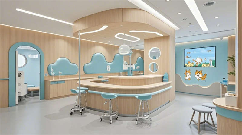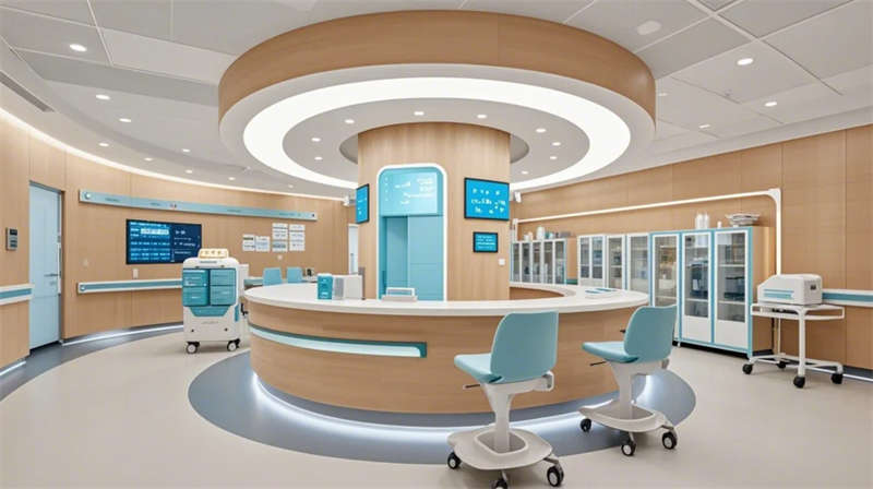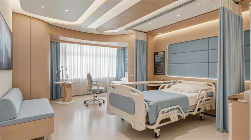 門(mén)診大廳以8米挑高空間構(gòu)建醫(yī)療門(mén)戶形象,曲面導(dǎo)診臺(tái)與智能分診系統(tǒng)形成高效服務(wù)樞紐,木紋格柵吊頂與綠植景觀墻弱化傳統(tǒng)醫(yī)院的冰冷感。兒科診區(qū)創(chuàng)新運(yùn)用馬卡龍色系與云朵軟包墻面,互動(dòng)投影游戲區(qū)搭配動(dòng)物主題診療設(shè)備,構(gòu)建兒童友好型醫(yī)療環(huán)境。VIP病房采用全景落地窗與智能護(hù)理系統(tǒng),可變形家具滿足陪護(hù)與康復(fù)雙重需求,展現(xiàn)高端醫(yī)療的溫度感。
