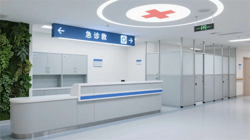 藥房區域的磨砂玻璃與金屬網隔斷,在通透與隱私間取得平衡;急診科模塊化設計確保高效響應,綠植墻緩解緊張情緒。全院統一運用防菌地材、圓角處理及無障礙細節,將安全關懷融入極簡美學。