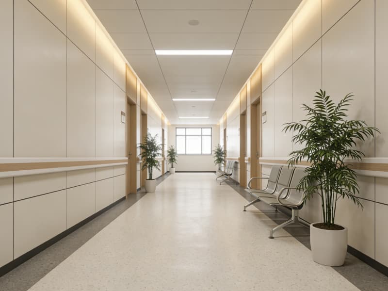門診大廳以淺木色與純凈白為基調(diào),挑高空間搭配懸浮式吊頂,自然光透過大面積落地窗灑入,與室內(nèi)精心布置的景觀綠植呼應(yīng),消解患者的緊張感。分診臺(tái)采用弧形設(shè)計(jì),圓角處理的臺(tái)面與溫潤(rùn)的材質(zhì)傳遞出細(xì)膩關(guān)懷。