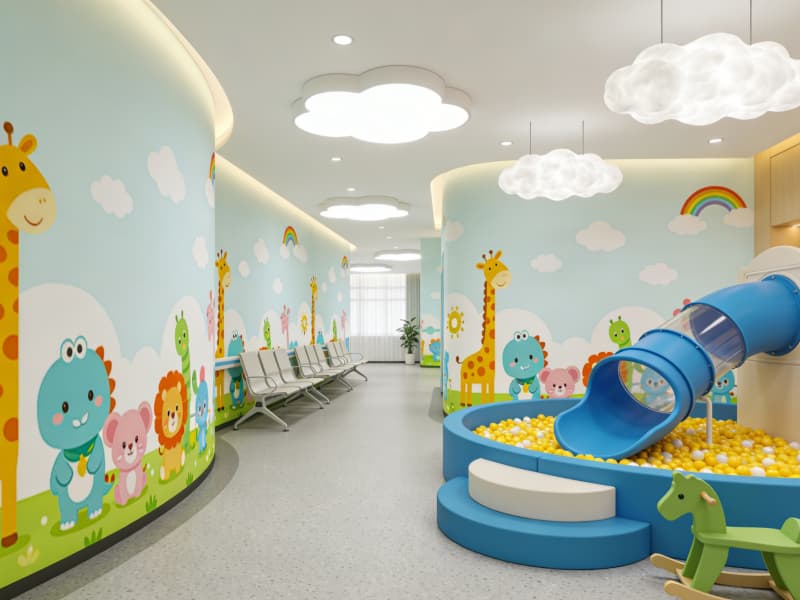 兒科專區(qū)則融入柔和的弧線與低飽和的馬卡龍色調(diào),墻面繪制童趣圖案,候診區(qū)設(shè)置小型游樂角,用輕松氛圍緩解孩童對(duì)就醫(yī)的恐懼。整個(gè)空間在保障醫(yī)療功能的同時(shí),讓自然與人文關(guān)懷貫穿始終。