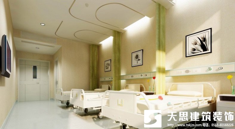 一般醫(yī)院多為一間病房有2~3間病床并配有衛(wèi)生間,病房門入口凈寬應(yīng)為1050mm,以保證單架車出入,門套應(yīng)能抗沖擊。壁柜按每床600mm即可。座便器選用后背懸掛式對清潔有利。床頭柜可用懸掛式。天花不易有多種造型,多用礦棉板或紙面石膏板。輸液架預(yù)埋龍骨。燈光應(yīng)多路控制。開窗為內(nèi)倒開為宜,以滿足通風、安全防護、方便清潔三種需要。入門口玻璃要選擇透明無色。